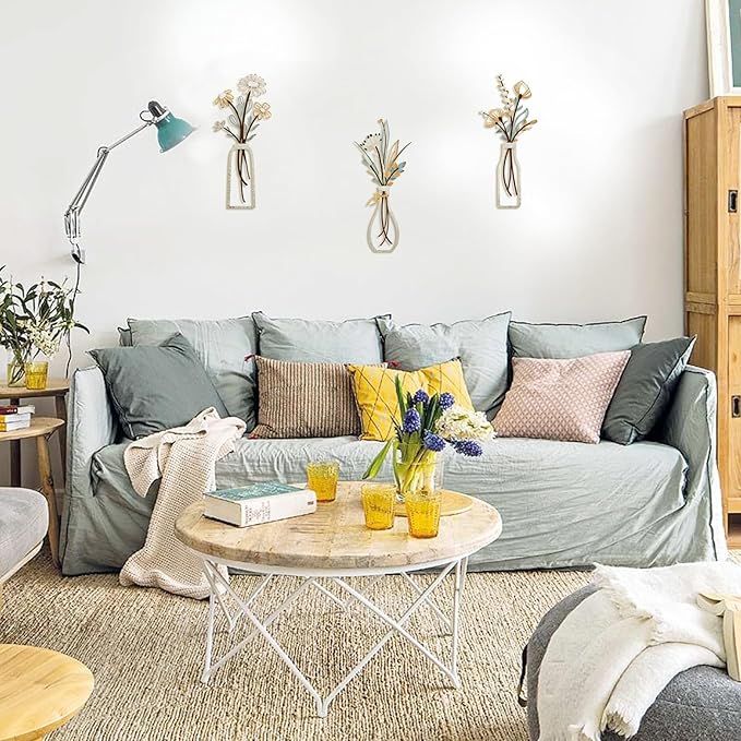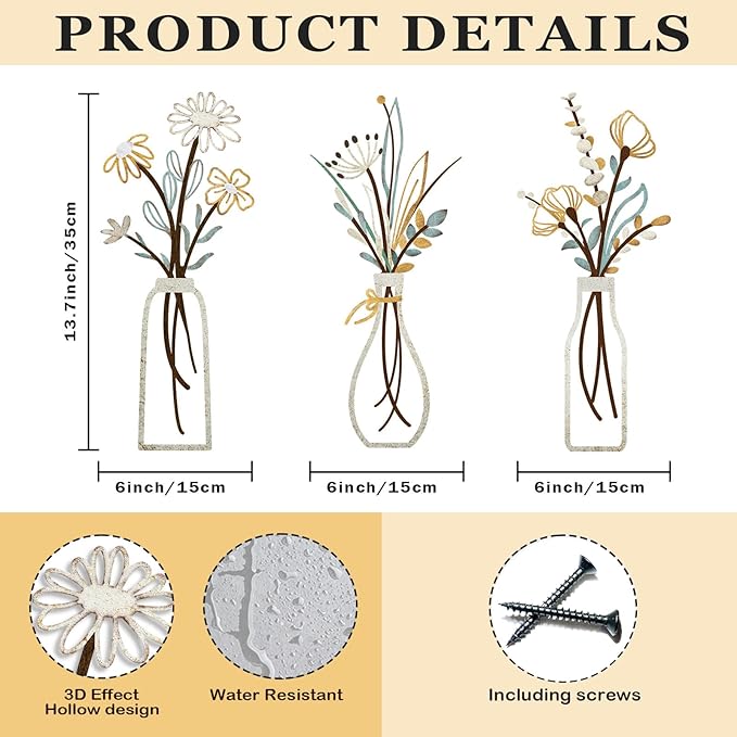 Elevate your home décor with this exquisite set of three metal flower wall art pieces, each measuring 6" x 13.7". Crafted with premium quality metal and designed with minimalist black flower silhouettes, these artworks bring a subtle yet striking touch of nature into any space. Perfectly suited for living rooms, bedrooms, dining areas, or bathrooms, they effortlessly complement various interior styles, especially modern boho and rustic farmhouse themes.